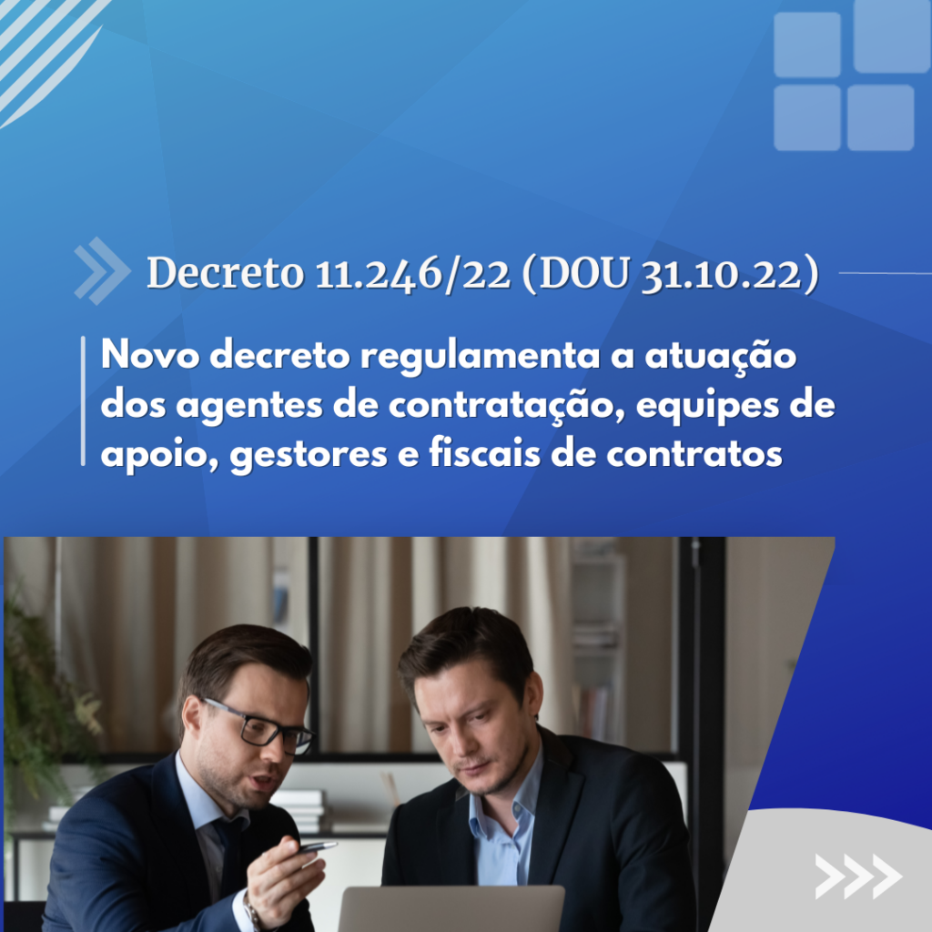 Foi publicado hoje (DOU 31.10.22) o novo Decreto Federal 11.246/22 que regulamenta o disposto §3º do art. 8º da Lei 14.133/21 (nova Lei de Licitações e Contratos), para dispor sobre as regras para a atuação dos agentes de contratação e das equipes de apoio, e também sobre o funcionamento das comissões de contratações e, ainda, sobre a atuação dos gestores e fiscais de contratos no âmbito da Administração Pública federal direta, autárquica e fundacional.